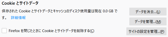 - [Cookie とサイトデータ]の[Firefox を閉じたときに Cookie とサイトデータを削除する]のチェックがついている場合はチェックを外してください。
