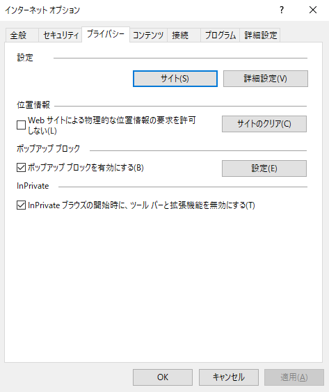 ※メニューバーが表示されていない場合は、キーボードの[Alt]キーを押します。 - [プライバシー]タブをクリックします。