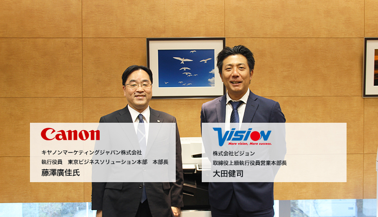 今回は、国内販売会社と代理店という違う立場にある、キヤノンマーケティングジャパン(以下、キヤノンMJ)の執行役員藤澤廣佳氏、販売代理店であるビジョンの執行役員大田健司という、複合機の販売パートナーのお二人にお話を伺いました。