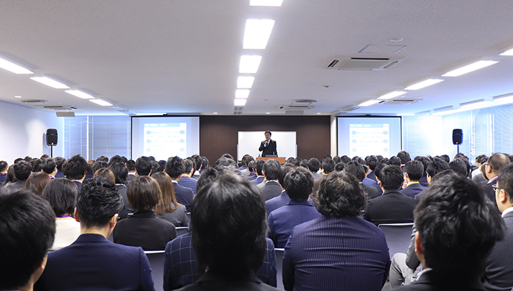ビジョンでは、毎年仕事始めの行事として、代表取締役社長 佐野より、その年のテーマについて全社員を対象とした事業説明会を行っています。