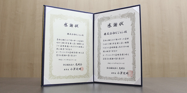 その取り組みが評価され、千葉県の地域障がい者支援団体『社会福祉法人 光明会様』から2年連続で感謝状をいただいております。